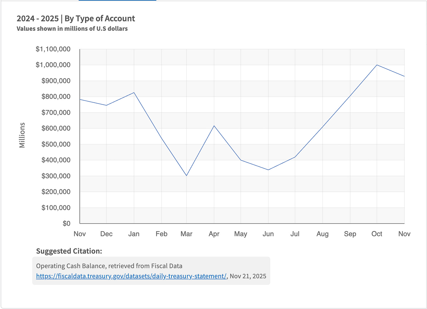 Macro is healing: TGA has just started to be spent down from $1T to $928B as of Nov 19. Meaningful spend of $200–300B and a couple weeks’ delay is positioning us for the end of macro correction in December — https://x.com/zerohedge/status/1990765251810505143 and https://fiscaldata.treasury.gov/datasets/daily-treasury-statement/operating-cash-balance